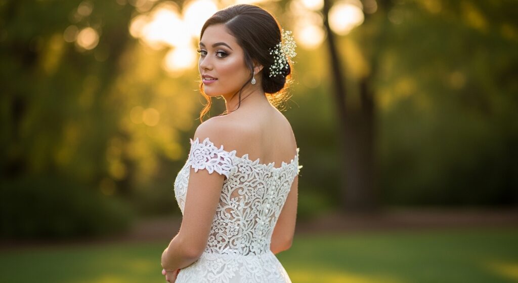 1. The Classic Low Chignon: Sleek, sophisticated, and timeless. A low chignon at the nape of your neck keeps the focus squarely on your shoulders. Add a delicate hairpin or fresh flowers for a touch of romance.