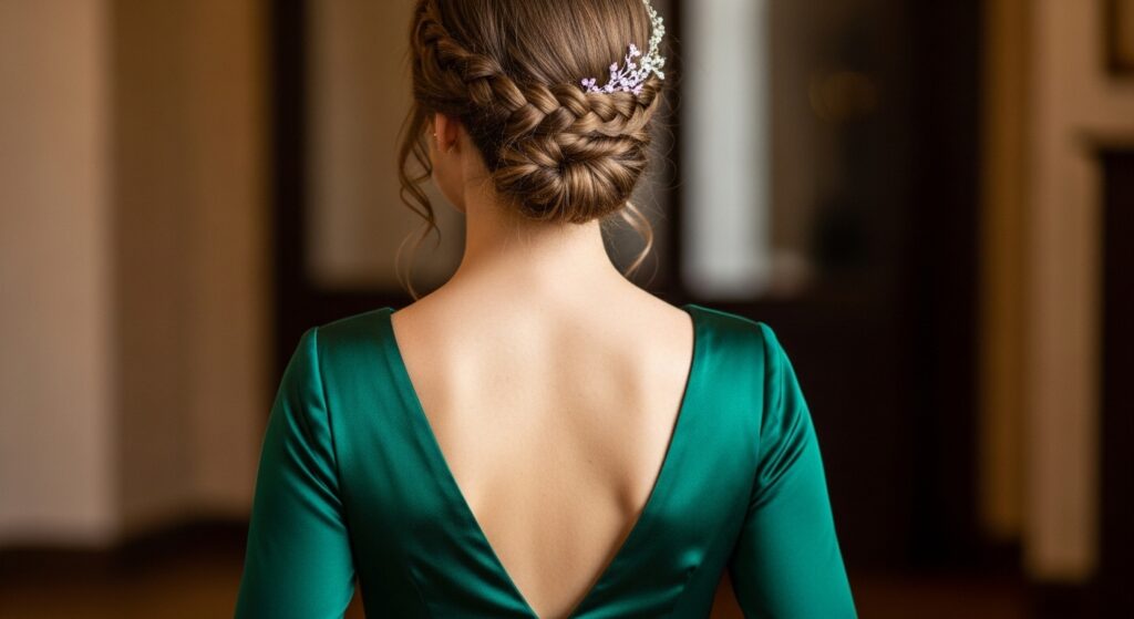 7. Intricate Braided Updo: A low updo with beautiful, intricate braiding is like jewelry for your hair. It provides a detailed focal point that leads the eye down to the dress’s back.