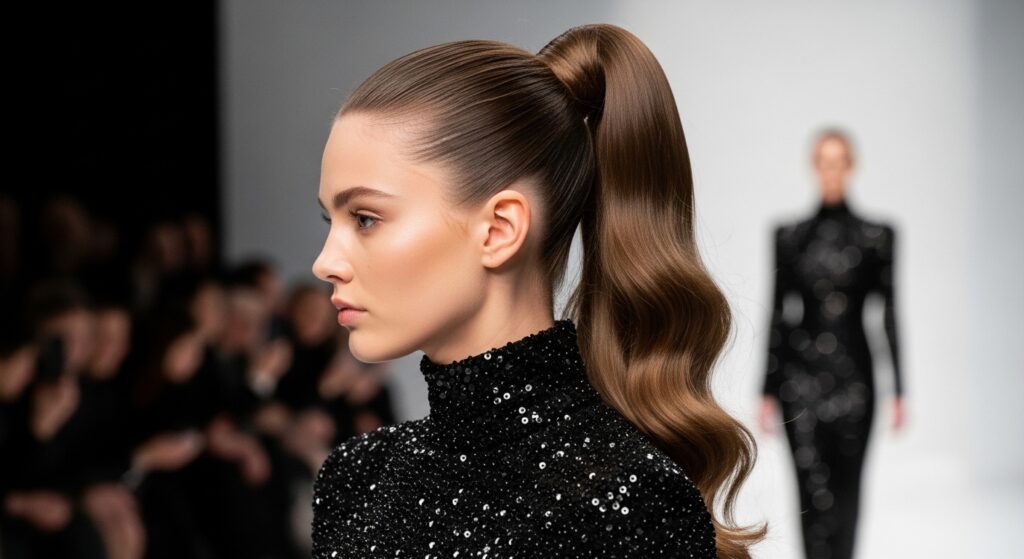4. Sleek High Ponytail: This isn’t your gym-day ponytail. A super-sleek, high-gloss ponytail pulled tight from the crown of the head is modern, powerful, and chic. Wrap a small section of hair around the base for a polished finish.