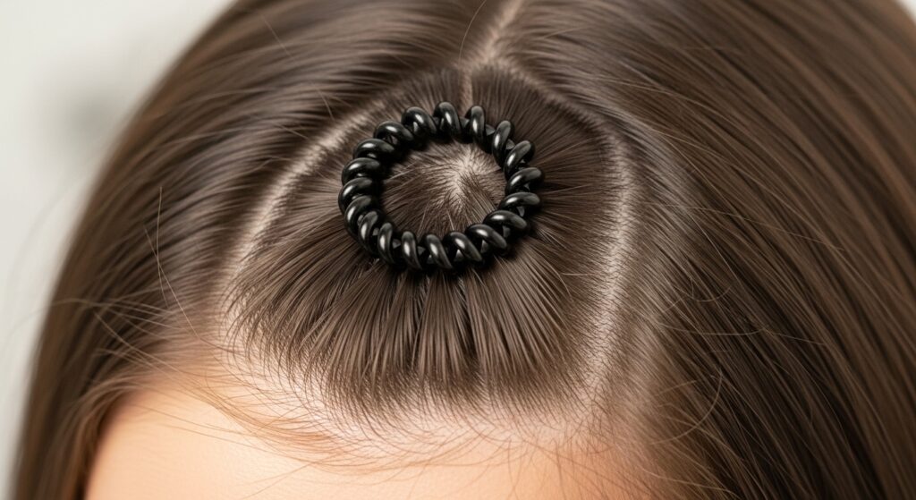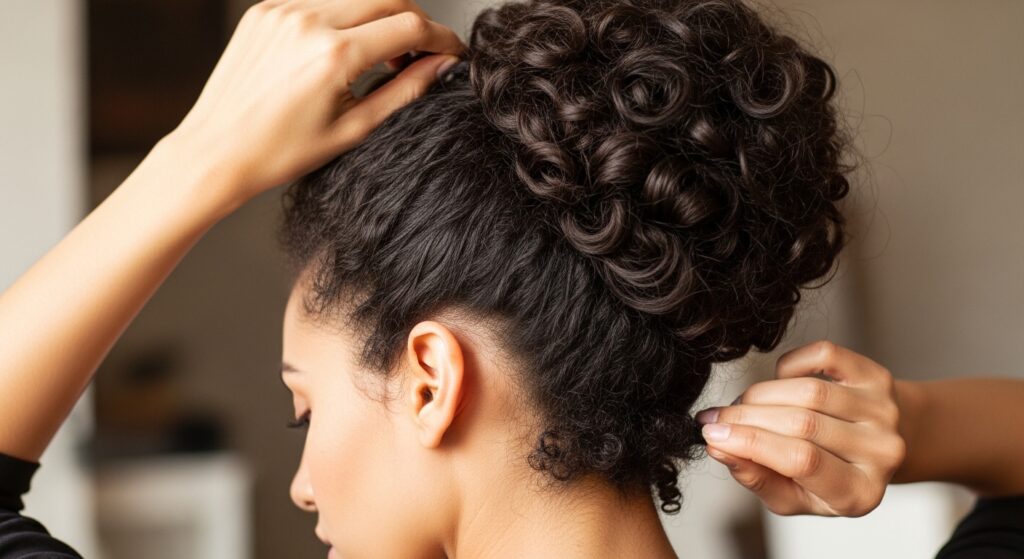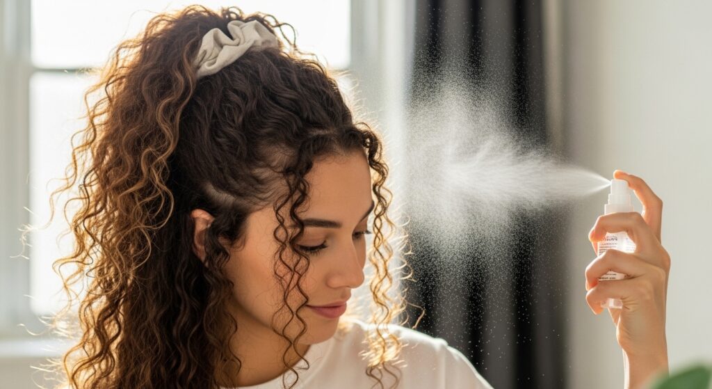 On refresh days, don’t just spray and scrunch wildly. Lightly dampen hair, then loosely pineapple the top half. Apply refresh spray or foam to the bottom half first, then release the pineapple and treat the top. This two-section method prevents over-wetting and maintains root volume.