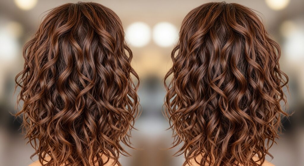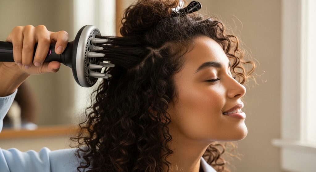 Create diagonal parts instead of straight ones, especially around the face and crown. This technique helps blend layers naturally and prevents the “section lines” that can sometimes show after drying. It also encourages volume at the roots as the curls dry in a less regimented pattern.