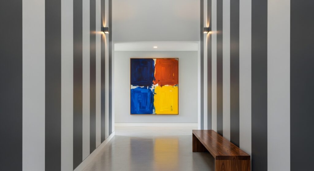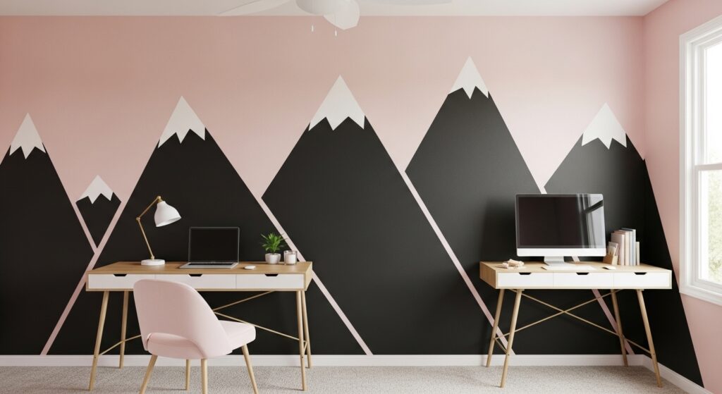 Move beyond straight lines with geometric shapes. Triangles, circles, squares, or organic shapes painted in two contrasting colors create a dynamic, modern, and graphic feel. This is a bold technique that works best as a focal point. It’s highly effective in children’s rooms, creative studios, and commercial spaces wanting to project energy and innovation.