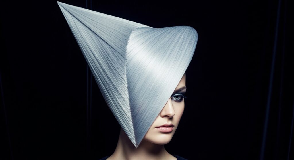 18. The Asymmetric Pyramid: Hair is swept entirely to one side and built into a teased, triangular pyramid shape that angles sharply from the temple toward the back.