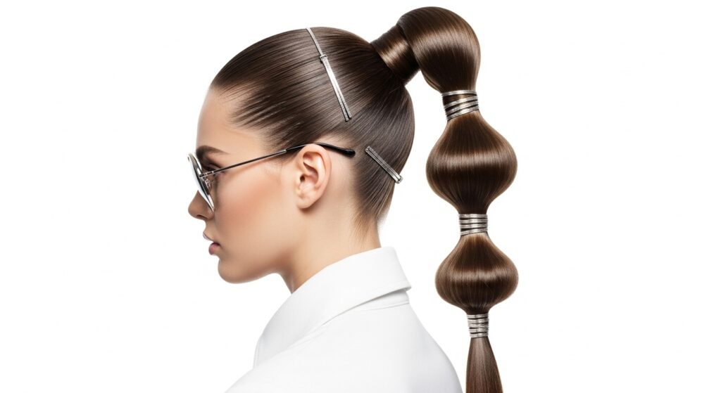 9. The Segmented Ponytail: Create a high ponytail and then section it into 3-4 equal parts. Wrap each section tightly with hair elbows or metallic clips at even intervals, creating a “blocked” graphic effect.