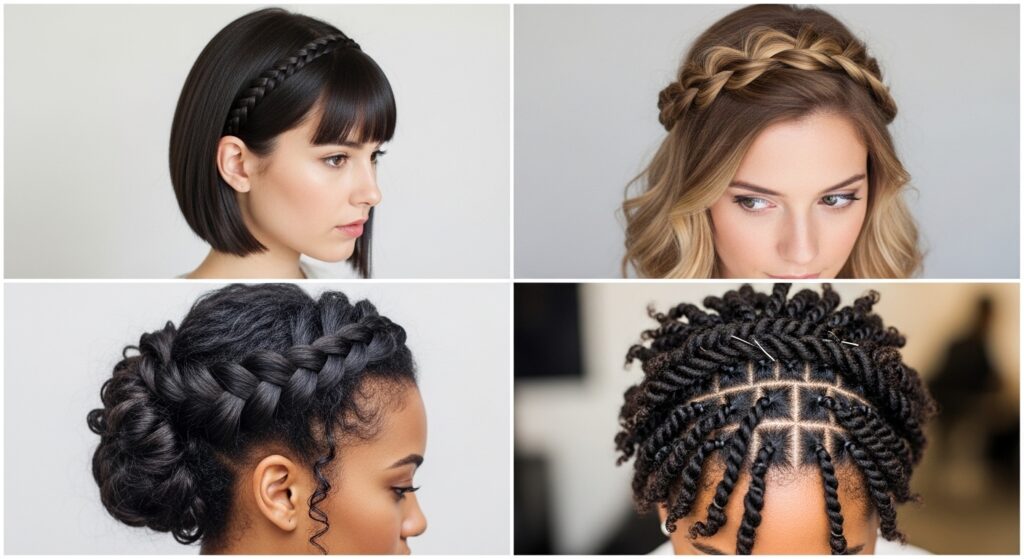 16. Crown Braids for Short Hair: Focus on the braided headband technique or create small, delicate braids along the hairline and pin them back to form a partial crown. Texturizing spray is your best friend for grip.