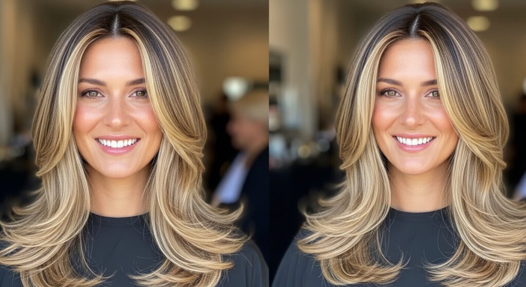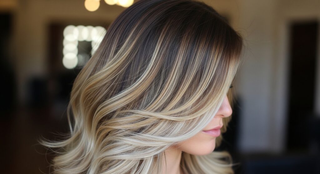 This two-step process involves first applying a darker, matte root shadow or smudge to blend with the natural base. Once processed and rinsed, foilayage highlights are applied over it. This creates incredible depth, a seamless root, and makes regrowth virtually invisible.