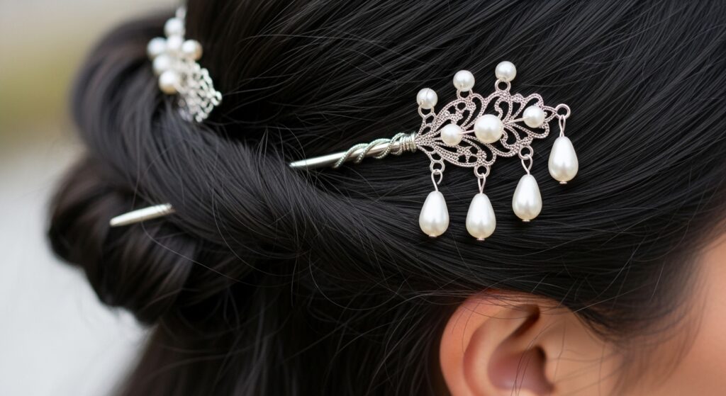 17. The Ornamental Side Piece: Simply pull the front section of your hair back. Twist it, then slide a stunning, decorative hair stick through the twist near your temple, letting the ornament dangle elegantly.