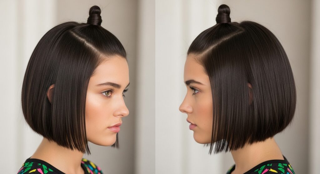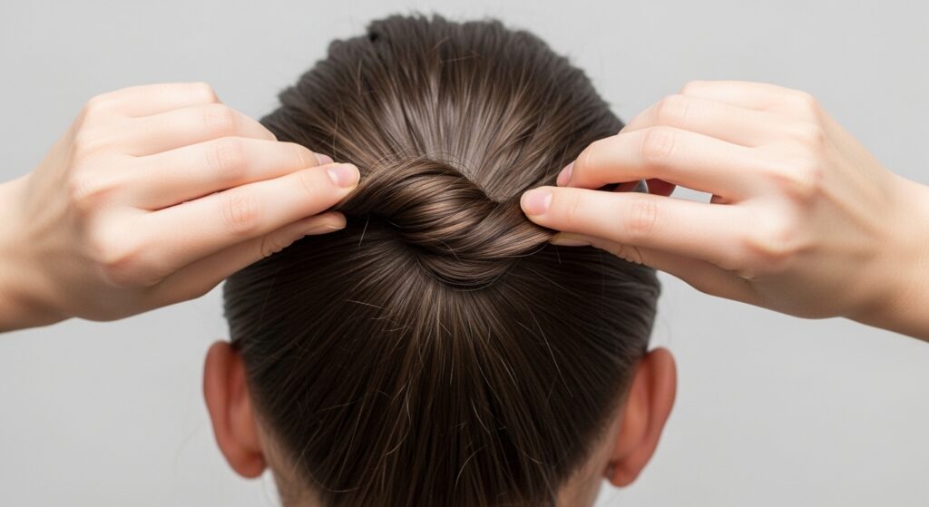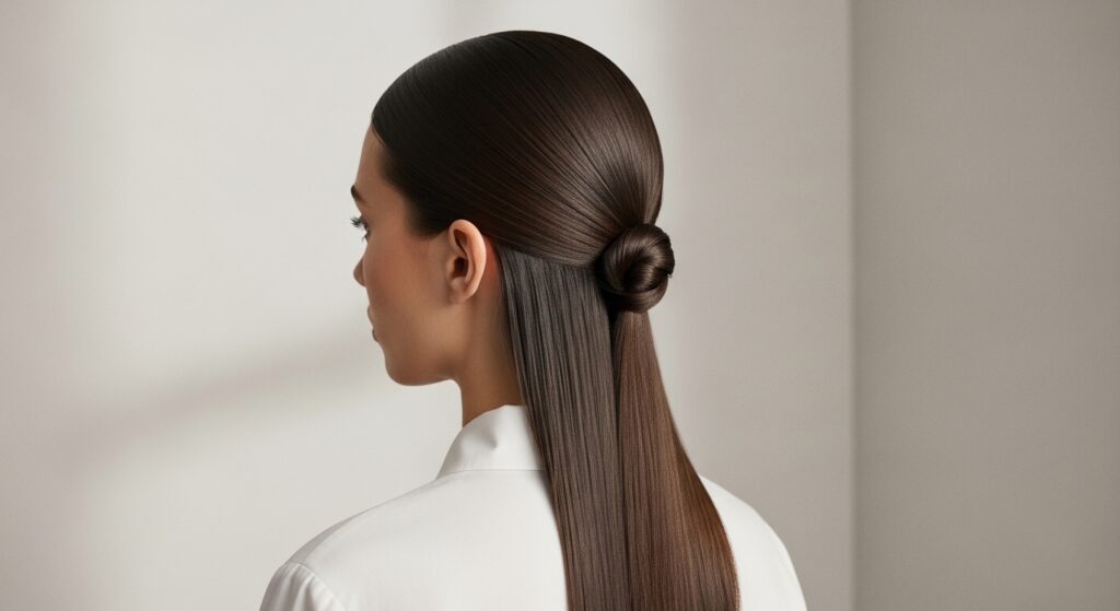 Start with the foundation. Take a small section of hair from the crown, twist it once, and secure it with a transparent elastic. Then, twist the length into a simple knot and pin it discreetly at the base. The result is a clean, geometric shape that looks impeccable with straight, glossy hair. It’s ideal for the office or any event where you want to project polished calm.