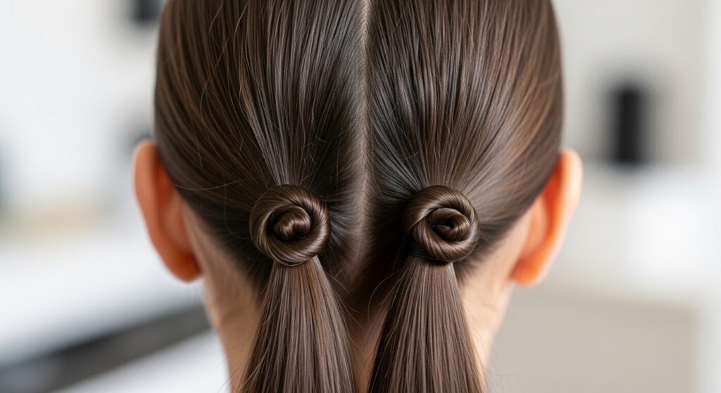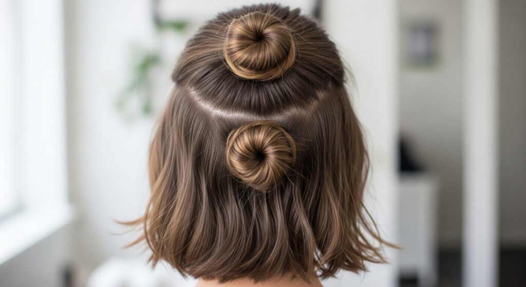 Create two small half-up sections, one above the other. Tie each into a tiny, clean knot or mini bun. This stacked effect is modern, playful, and perfect for medium-length hair that might not have the length for one dramatic knot.