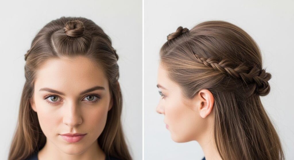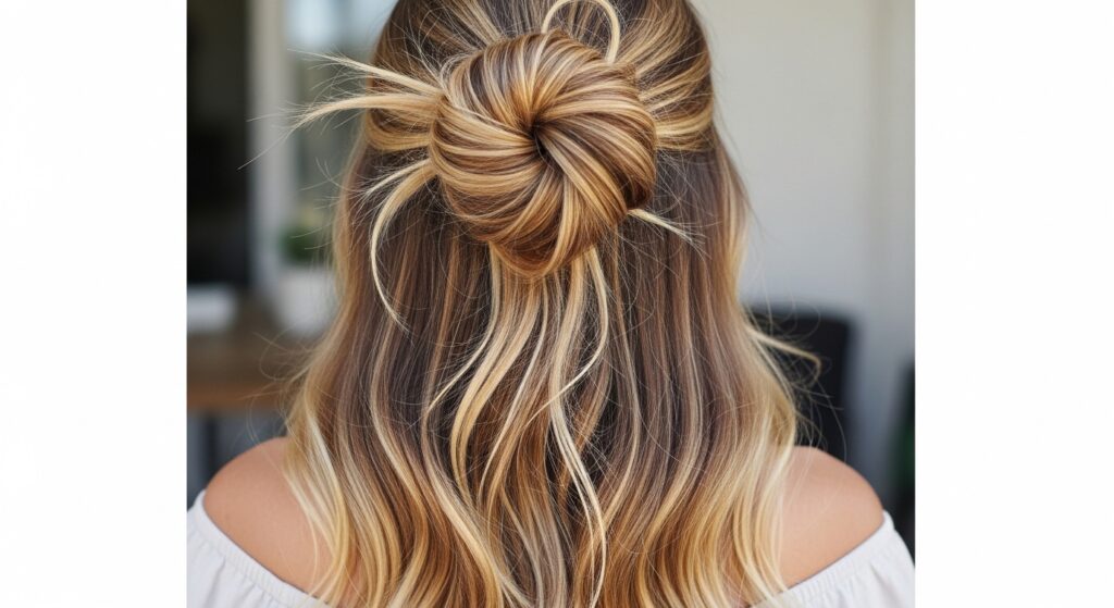 For a touch of architectural interest, create two small knots side-by-side at the nape of your neck. Part the half-up section down the middle, make a knot with each side, and secure them individually. This style is surprisingly simple but makes a subtle, statement detail that’s visible from all angles.