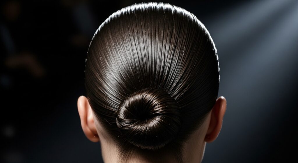 Apply a strong-hold gel or mousse to damp or dry hair to create a slicked-back effect. Gather the top section and form a tight, precise knot. This is a bold, high-fashion take on minimalism that embraces extreme sleekness and control.
