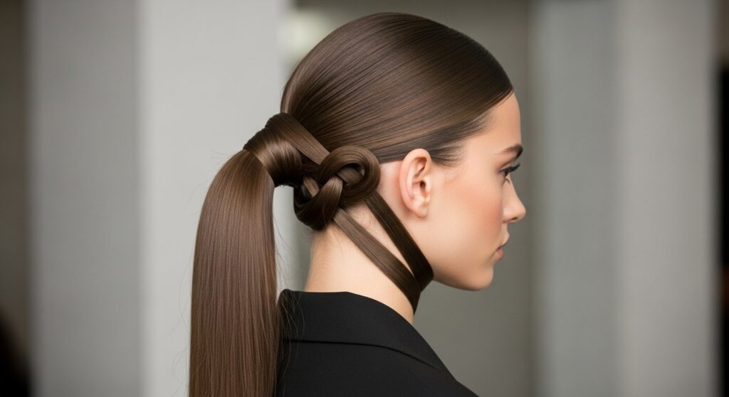 Blur the line between a half-up style and a full ponytail. Create a high half-up section, tie a knot with it, and then incorporate the knot into a low or mid-height ponytail with the rest of your hair. It’s a functional and stylish way to keep hair off your face while maintaining a clear design element.