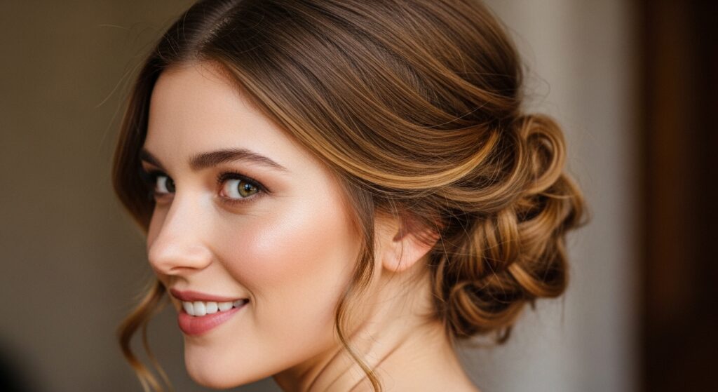 Ditch the center part. Deeply part your hair to one side and gather the hair from the heavier side only, pulling it across the back of your head before forming a loose knot. This creates an asymmetric, flowing line that is deeply flattering and feels modern and romantic.