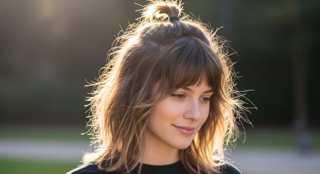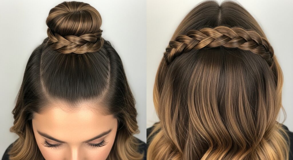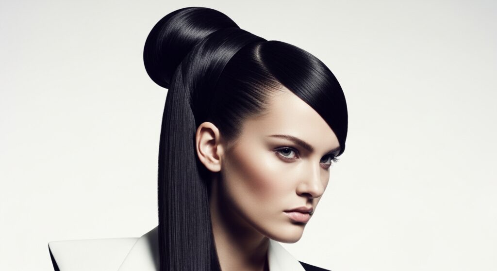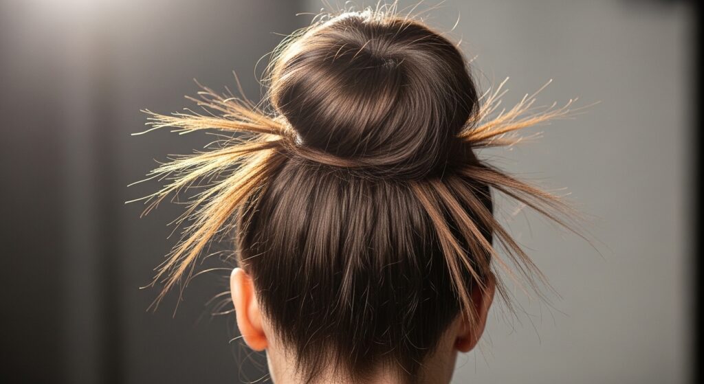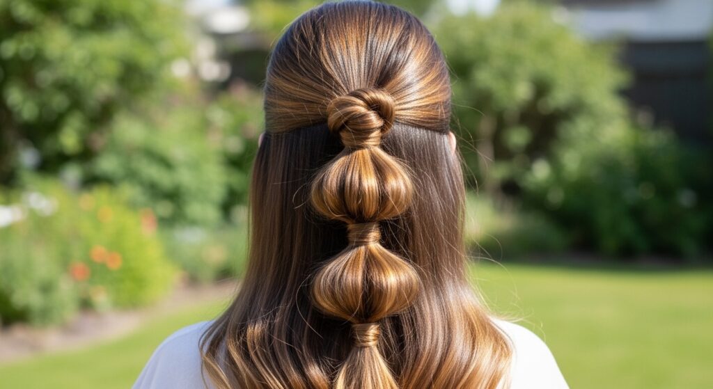 Embrace the fun, retro-futuristic vibe of bubble styles. Create your half-up top knot first. Then, take the remaining half-up ponytail section below the bun and add 2-3 hair ties down its length. Gently puff out the sections between the ties to create “bubbles.” This adds incredible volume and playful geometry to the look.