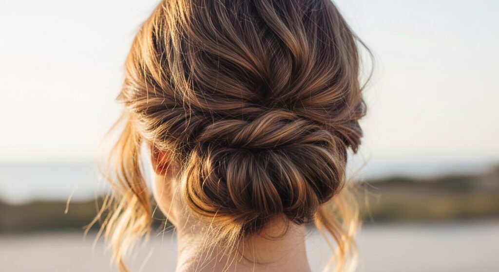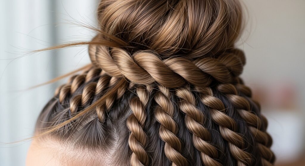 Texture and interest, achieved simply. Take the top section of your hair and split it into two equal parts. Twist each section tightly in the same direction, then twist them together around each other. Wrap this twisted rope into a bun and secure. This technique creates a beautiful, textured knot that looks far more complicated than it is, and it holds remarkably well on slippery hair.