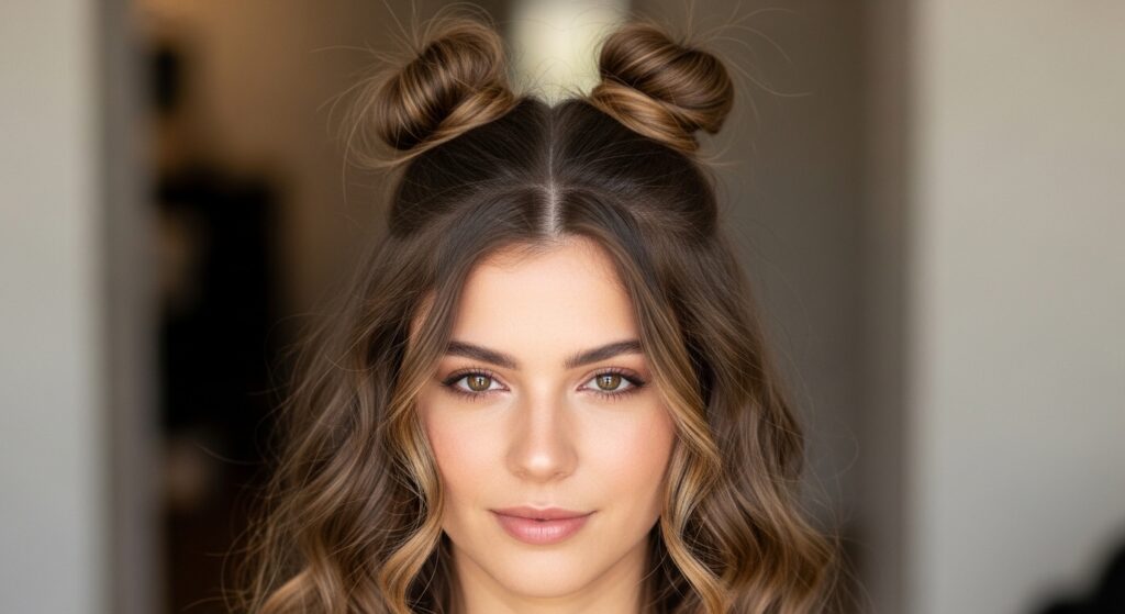 Double the fun, double the knots! Part your hair down the middle. On each side, create a half-up section (including hair from the back) and twist it into a mini top knot or space bun. Position them high and symmetrically. This ultra-playful look is perfect for festivals, themed parties, or just adding a dose of personality to your day.