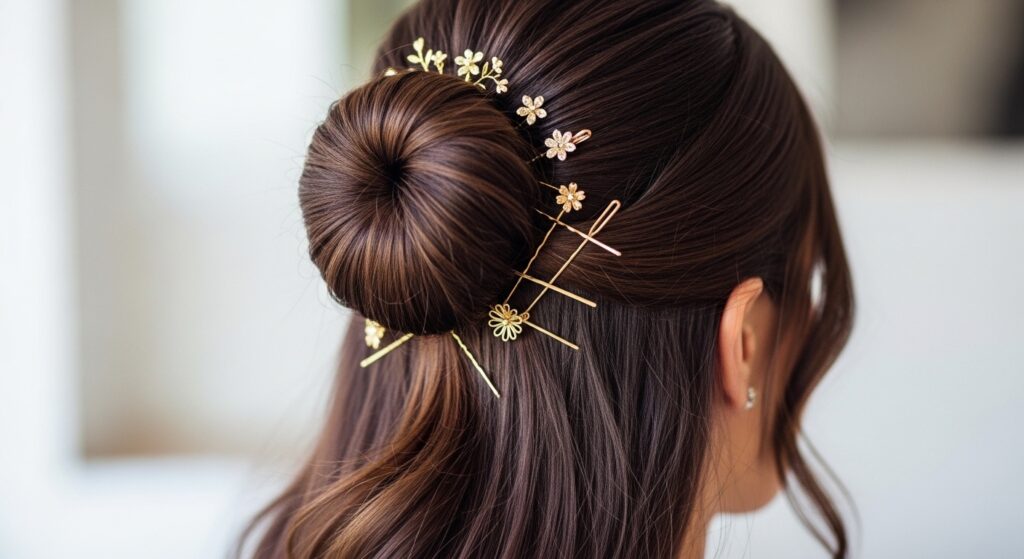 After creating a simple, clean knot, adorn it with minimalist hair clips, pearls, or statement barrettes. Place them around the base of the knot, or use them to pin back face-framing sections in an artistic way. This is the easiest way to customize your look for any event, from a wedding to a night out.