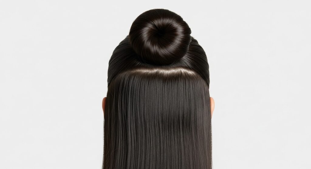 A hybrid style that offers the best of both worlds. Create a half-up ponytail high on your crown, but instead of making a bun, take a small section of hair from the ponytail and wrap it around the hair tie to conceal it. Secure the end underneath with a bobby pin. This gives the illusion of a knot but with a different, slightly more streamlined silhouette.