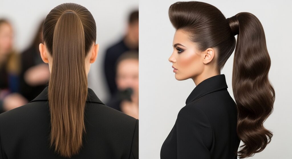 18. Ponytail with a “Bump”: Tease the crown heavily, then smooth over. When securing your ponytail, allow a small, intentional “bump” or bubble at the crown before smoothing the hair into the tie. This retro touch adds significant height.