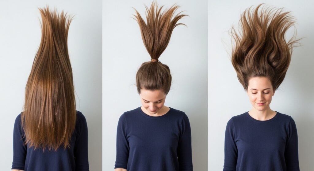 4. The “Flip and Tie” Method: Bend forward at the waist, letting all your hair fall toward the floor. Gather it at the crown and secure with a hair tie while still upside down. Flip back up—the height is automatic.