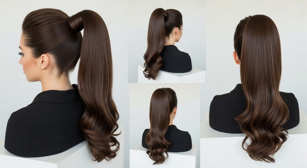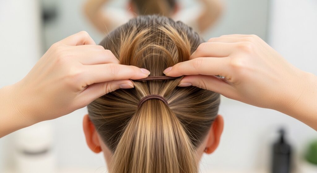 8. The “Pony Tailor” or Hairpiece: Insert a volumizing hairpiece (like a “pony tailor”) under your top layer before gathering your hair. When you tie the ponytail over it, it creates instant, hidden fullness at the base.