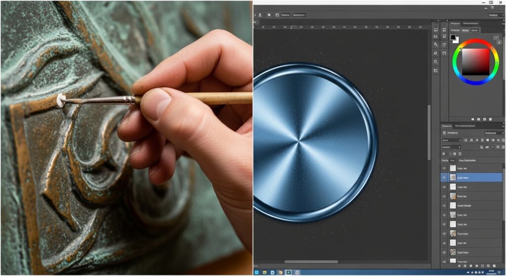 For Digital Design: Flat color won’t look metallic. You must create a gradient or use layer styles. A simple method is a linear gradient from your shadow color (dark) to your base color (mid) to your highlight (light). Add a subtle noise texture or a low-opacity pattern to simulate grain. Consider using overlay or soft light layers for additional sheen.