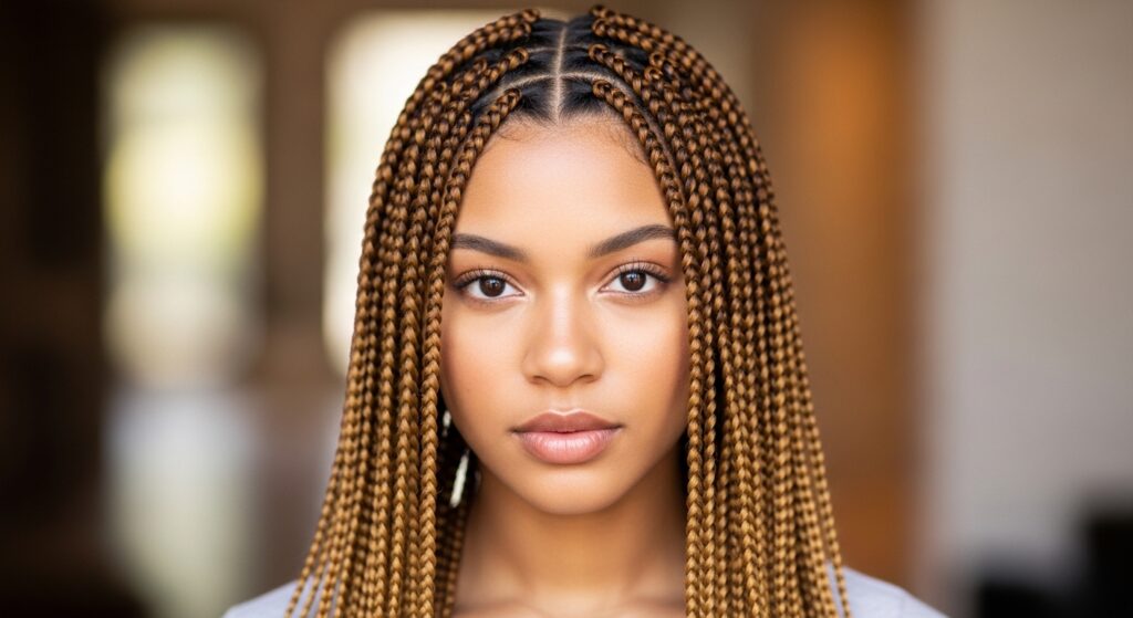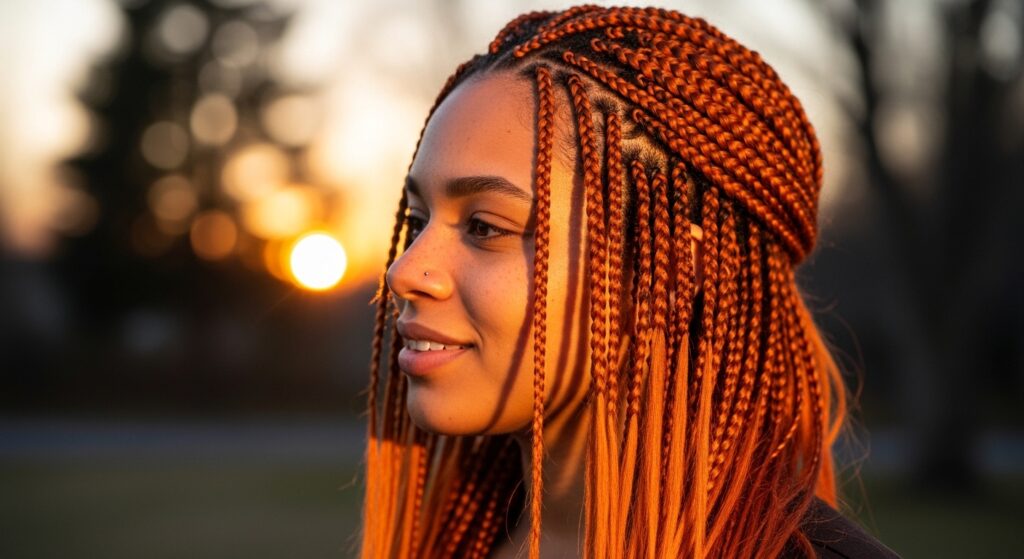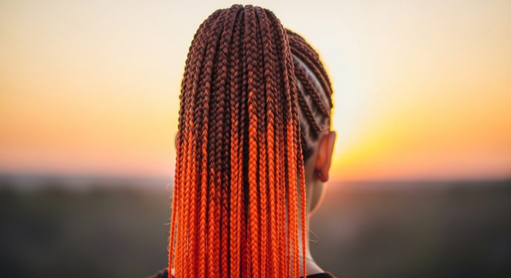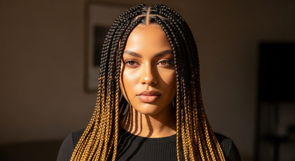 Let’s start with a classic that never fails to impress. This combination mimics the natural sun-kissed effect, where deep chocolate brown at the roots seamlessly melts into a warm, creamy caramel towards the ends. It’s universally flattering, adds incredible dimension to your braids, and works beautifully for both box braids and knotless styles. It’s the perfect “my hair but better” ombre for those wanting a touch of sunlit magic.