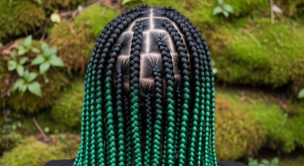 Go bold with the color of nature and mystery. The stark contrast between solid black and a vivid emerald green is breathtaking. It evokes a sense of enchantment and edge. This combo shines in thicker braids or even in loc styles, making the green appear like precious gemstones threaded through your hair.