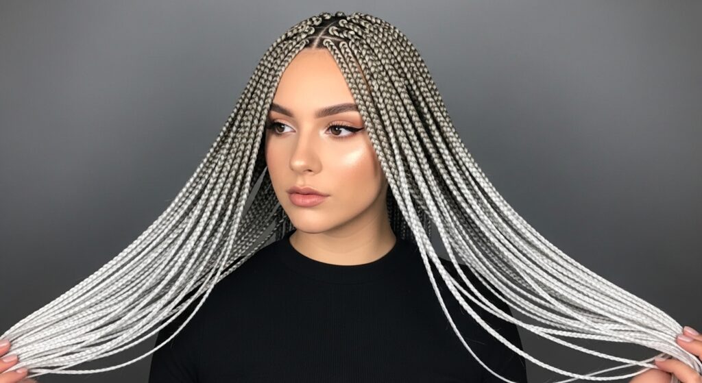 Embrace your inner ice queen with this cool-toned masterpiece. Starting with a soft ash blonde, the color gradually fades into a shimmering, metallic silver. This ethereal and modern look is ideal for lemonade braids or faux locs. It requires some bleaching, but the payoff is a futuristic, high-fashion style that stands out in any crowd.