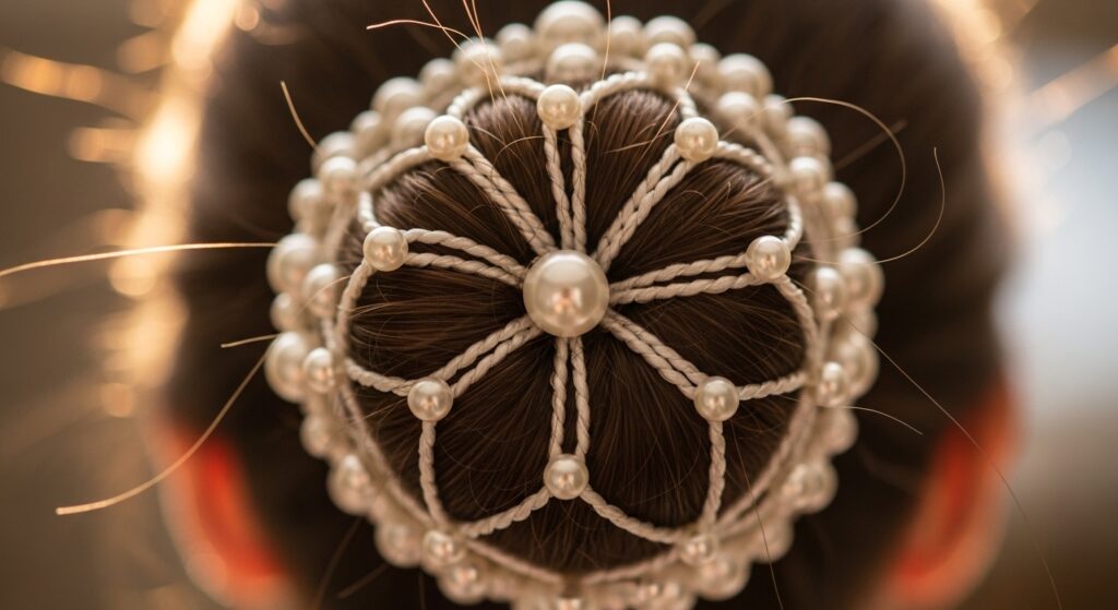 This style is less about precision and more about creating a beautiful, pearl-strewn landscape in your hair.