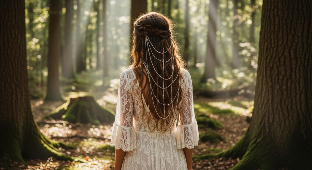 For the ultimate in bohemian romance, forgo a structured braid. Create loose, tousled waves, then drape multiple long, pearl-adorned hair chains through your hair. Weave a few thin, irregular braids randomly through the waves, and tuck the chains in and out of these braids, creating a look of effortless, ethereal beauty.
