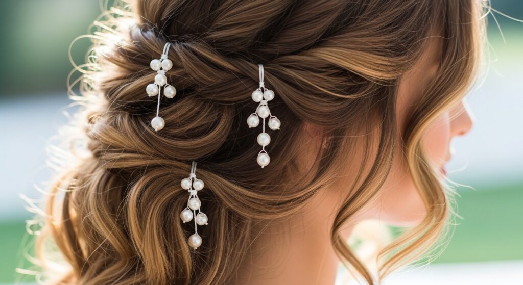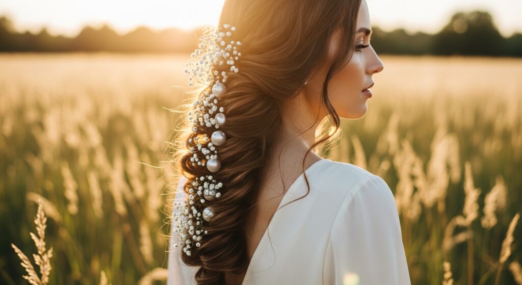 Sometimes, less is profoundly more. A simple three-strand braid, whether worn down or incorporated into a half-up style, can be elevated with just three to five strategically placed pearl pins. Space them out evenly along the braid’s length for a modern, understated elegance that is perfect for bridesmaids or a minimalist bride.