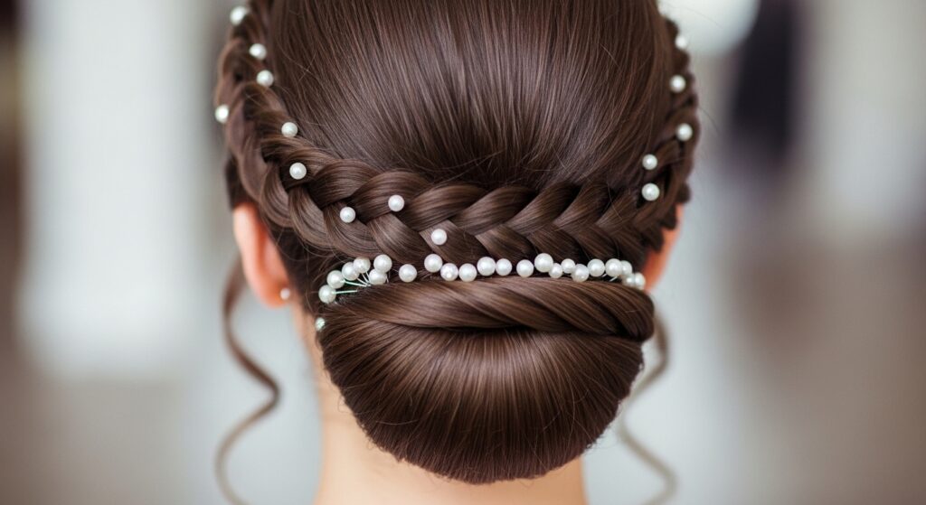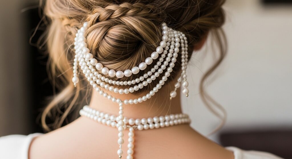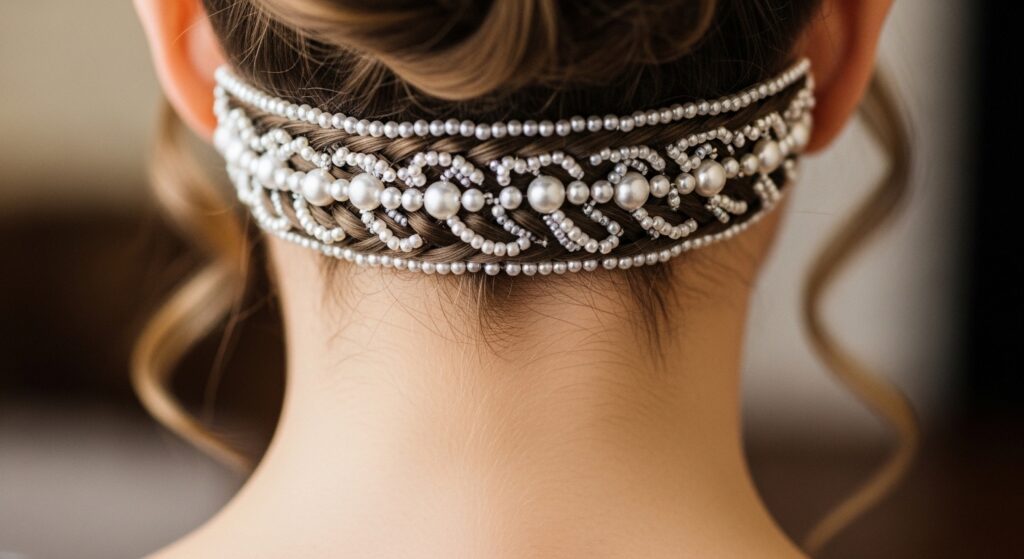 This is a breathtaking detail for a low-backed wedding gown. Design a delicate braided pattern at the nape of your neck, just above the hairline. This could be a small, horizontal Dutch braid or an intricate Celtic knot. Embellish this braid exclusively with pearls. When you wear your hair up, it creates a stunning “hair choker” effect that complements your dress perfectly.