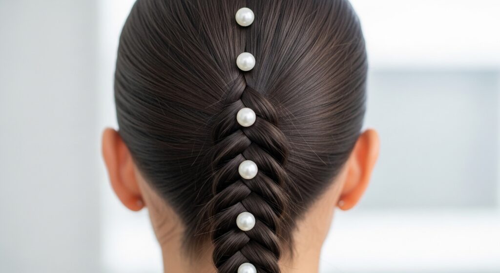 A French braid that transitions into a ponytail is a classic. To embellish it, add pearls as you braid. Use a needle and thread to string pearls onto clear fishing line, then braid this line in as one of your three strands. The result is a continuous, seamless line of pearls embedded within the braid, flowing into the ponytail.
