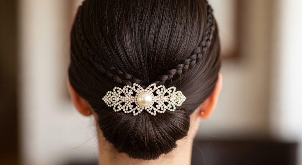 This style offers a stunning blend of structure and sparkle. Begin with a deep-side-parted Dutch braid, incorporating the hair from your temples back. Then, twist the remaining hair into a low bun or chignon. The key is to strategically pin pearl hairpins along the braid’s ridge and scatter a few around the bun, creating a cohesive and polished look.