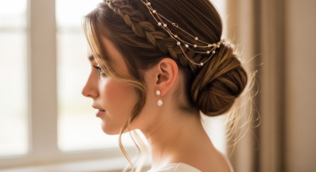 Channel ancient elegance with soft, face-framing braids swept back into a low bun or twist. Create two braids starting at your temples, following the curve of your cheekbones back. After pinning them, lace a delicate pearl chain through the braids or along the hairline, securing it with hidden pins. It’s a look of serene, timeless beauty.