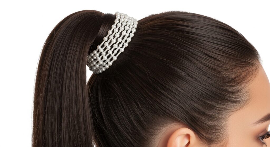 Elevate a simple ponytail by adding a braid and pearls. Create a ponytail, then take a small section from it to wrap around the base, hiding the elastic. Before wrapping, braid that section and weave pearls into the braid. As you wrap the pearl-embellished braid around the base, you create a stunning, customized ponytail holder.