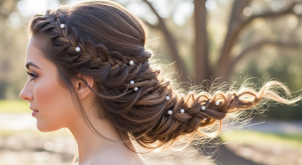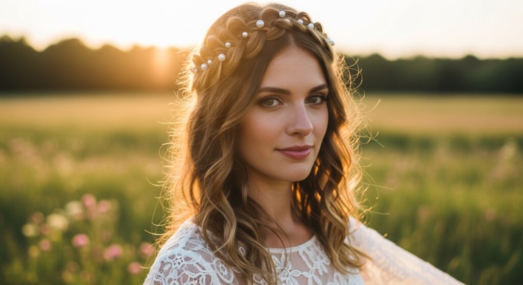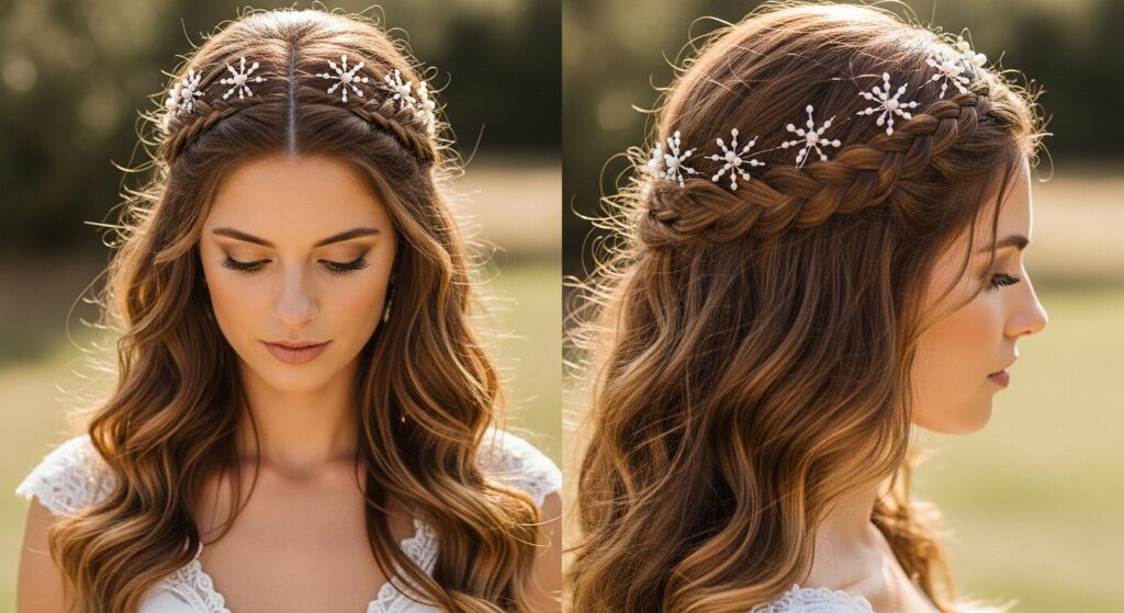 For those who love to wear their hair down but want a touch of bridal detail, a half-up style is perfect. Create two small braids from the temples, pull them back, and secure them at the back of your crown. Then, adorn the intersection with beautiful pearl-tipped pins or a small pearl cluster hairpiece. This look is effortlessly chic, allows for beautiful hair movement, and is surprisingly quick to achieve, making it a great last-minute elegant option.