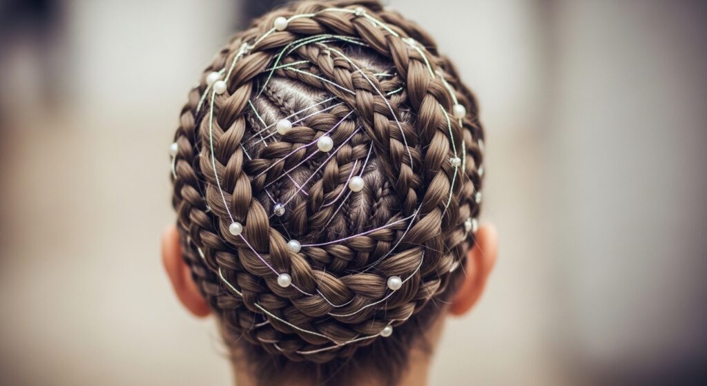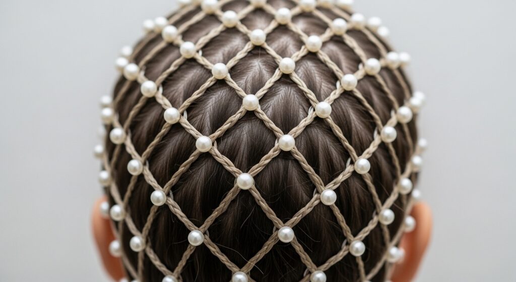 Dive into vintage glamour with a style inspired by the Victorian era. Create a series of small, tight braids at the back of the head, then pin them into an intricate pattern resembling a net or lattice. At each intersection, secure a small pearl bead. This highly detailed look is a masterpiece of hair artistry and pairs exquisitely with high-neck lace gowns and heirloom jewelry, perfect for a formal, black-tie wedding.