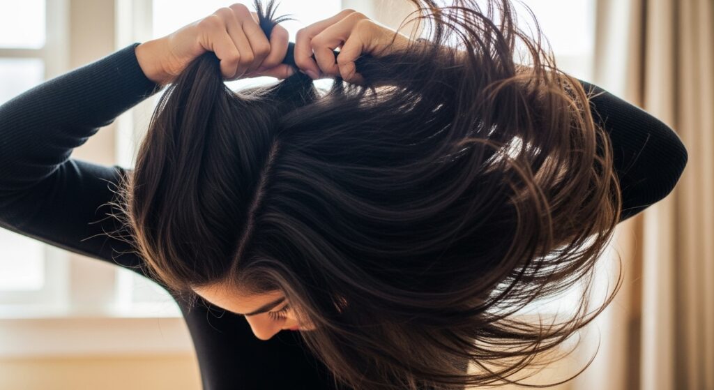 This is different from the fluff-and-go. Before bed on day two, lightly mist the lengths of your hair with water or a leave-in spray. Then, pineapple it loosely. Overnight, the curls will reset in a lifted position. In the morning, take it down, shake, and go. You’ll have preserved volume and definition with zero morning effort.