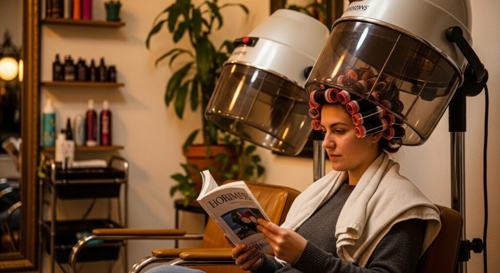 Roll your set as usual, then sit under a hooded dryer until your hair is about 90% dry. Let the rest air-dry completely. This prevents over-drying and keeps hair incredibly soft and shiny.