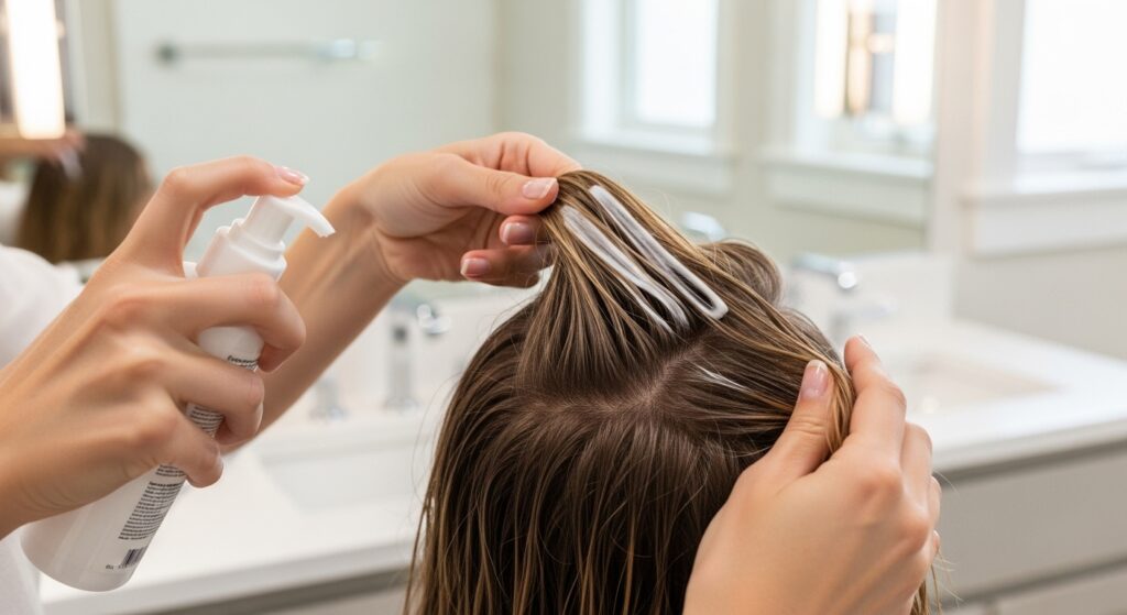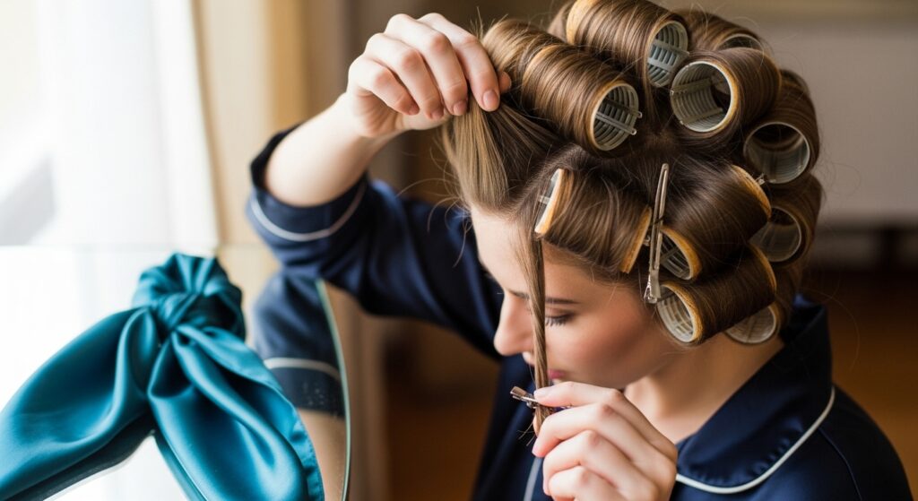 After removing rollers and brushing, wrap your hair smoothly around your head and secure with clips, covering with a satin scarf for 10-15 minutes. This sets the style, smoothes any flyaways, and creates a flawless silhouette.