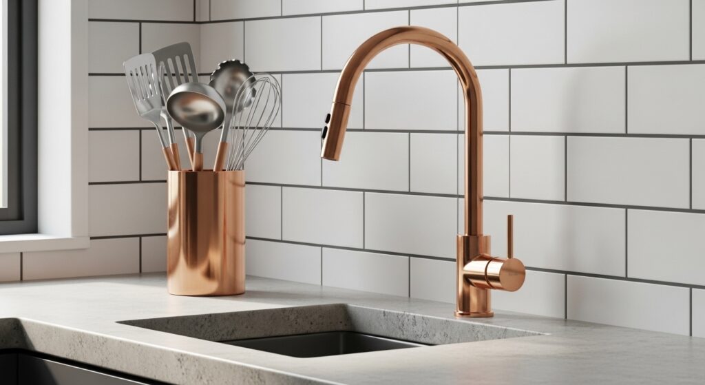 3. Rose Gold + Warm Taupe: Taupe is the perfect neutral partner—it has both grey and brown undertones, making it a chameleon that complements rose gold’s complexity. It feels incredibly cozy and contemporary.
