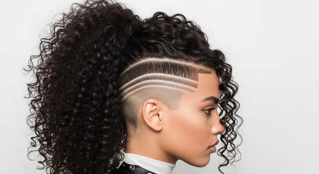 This idea is a celebration of texture. Voluminous, defined curls are gathered into a wonderfully chaotic high ponytail. The shaved side is often tapered—shorter at the hairline and blending slightly longer toward the back—which complements the natural shape of curly hair. The contrast between the untamed, joyful curls and the precise, clean shave is absolutely mesmerizing. It’s a powerful look that embraces natural texture while making a fierce stylistic statement.
