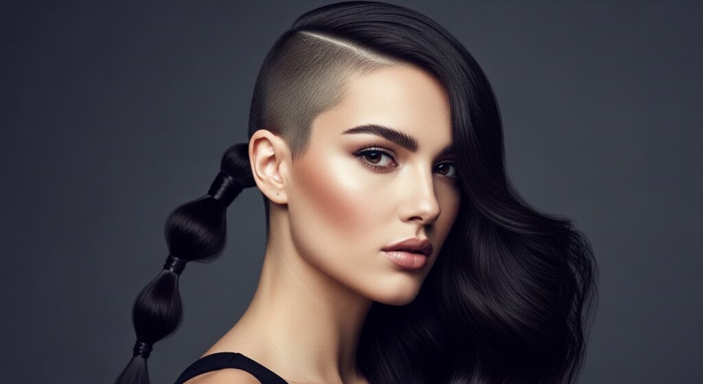 Why choose between braids and a shave when you can have both? This idea incorporates intricate braiding into the ponytail itself, which starts from the unshaved side. The shaved section can be a blank canvas for a simple, clean look or can be elevated with razor-cut designs like zigzags, lines, or geometric patterns. The braid adds a touch of bohemian complexity, while the shaved design injects modern, personalized edge. It’s a multifaceted look that tells a story.