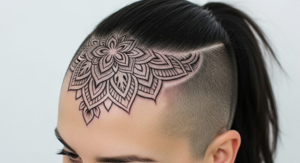 Elevate your shaved side into a work of art. This idea is for the true individualist. The shaved area becomes a canvas for a detailed, delicate design—think mandalas, floral vines, or celestial patterns. The ponytail is kept simple, sleek, and elegant to let the intricate artwork shine. This requires a skilled barber or stylist but results in a breathtaking, temporary tattoo-like effect that is uniquely yours.