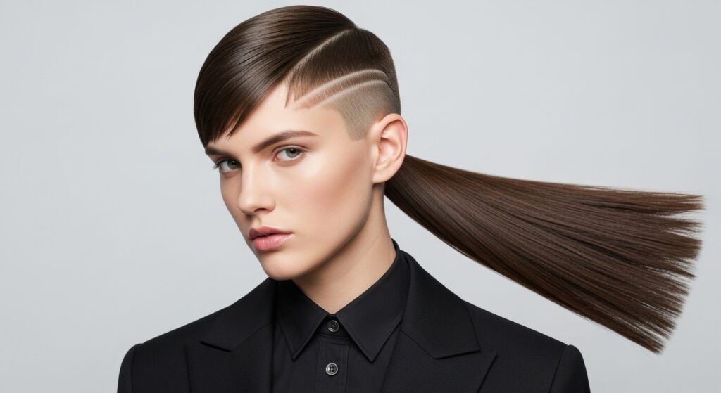 Deconstruct the traditional ponytail with this creative take. Instead of one side shaved, imagine a central strip shaved in a mohawk style from forehead to nape. The remaining hair on each side is then gathered into two symmetrical ponytails—high, low, or one of each. This creates an incredible architectural, symmetrical-asymmetric balance. It’s playful, unexpected, and perfect for showcasing vibrant hair colors on the ponytails against the neutral scalp.