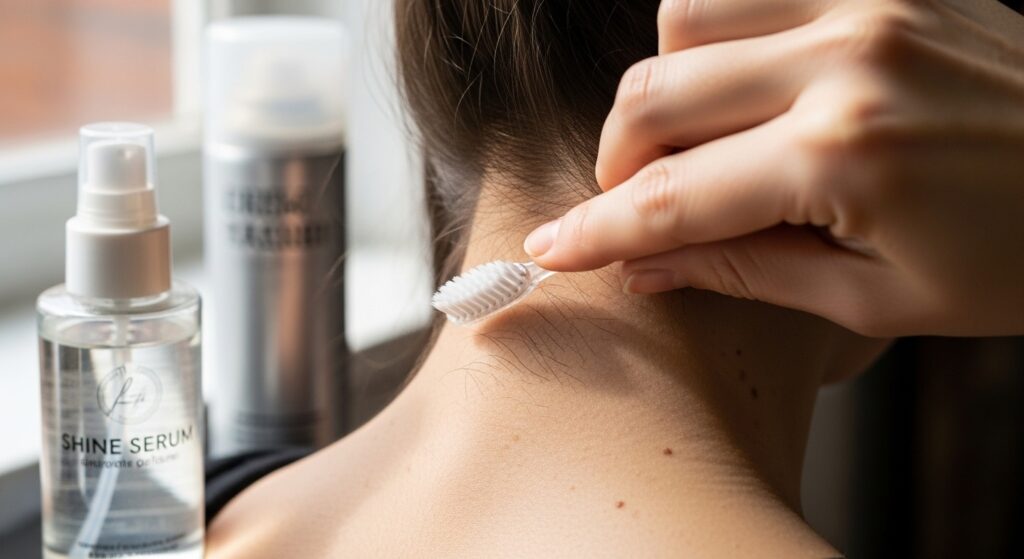 Your updo is pinned, but the work isn’t over. To achieve that true glass-like finish, you must seal and perfect. First, use a toothbrush or a tiny mascara wand sprayed with a light-hold hairspray to gently tame every single baby hair and flyaway along your hairline and nape.