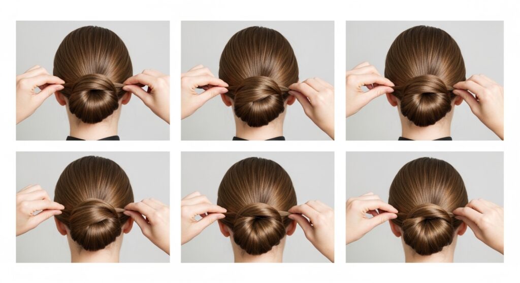 4. The Donut Bun for Amplified Smoothness: Using a hair donut that matches your color, slide it over your ponytail. Distribute hair evenly around the donut, tucking the ends under, and secure with a pin. The donut provides a perfectly round, smooth foundation.