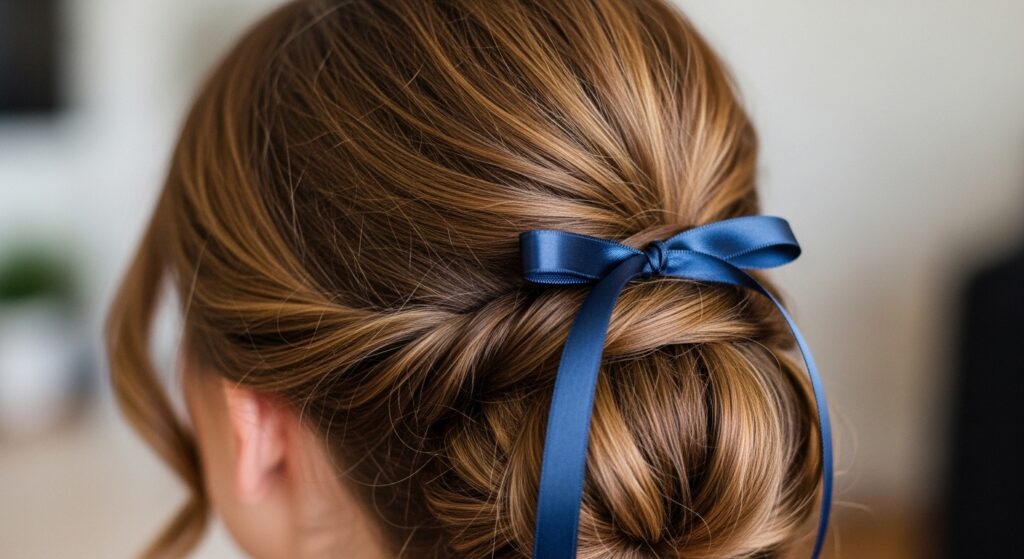 Never underestimate the transformative power of a simple ribbon. Weave a satin ribbon through the twists of your updo, or use it to tie the base of the bun. A black ribbon adds classic polish, a velvet one brings a wintery feel, and a brightly colored or patterned ribbon instantly makes the style more playful and personal.